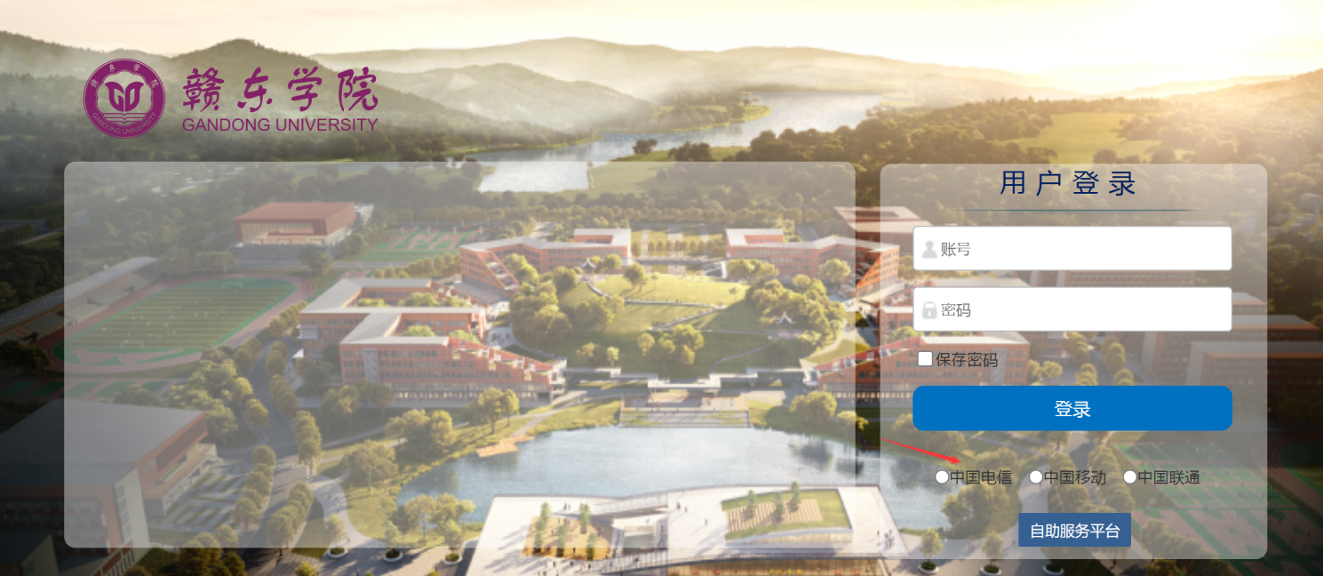 点击认证页面下方“自助服务平台”按钮进入账号绑定操作,在自助服务平台界面使用校园网账号和对应密码登陆。
