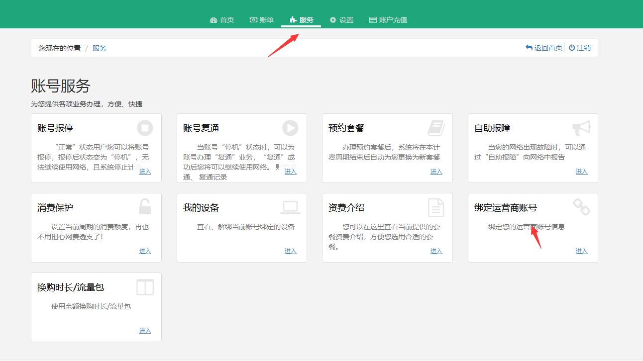 绑定宽带账号:输入学号和密码登陆自助服务平台后,找到“服务”,然后进入“绑定运营商账号”,然后按照提示输入运营商宽带账号及宽带密码,提交,关闭该页面,完成整个绑定操作(注:绑定操作仅需完成一次即可)。